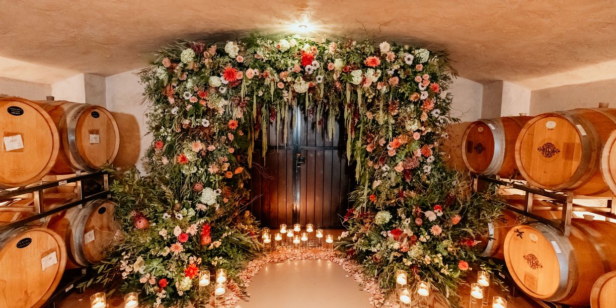 Behold the stunning floral arch, a personal favorite, radiating romance and magic. We transformed a 9-foot wine cave doorway into a whimsical garden gate for an intimate wedding ceremony. Crafted on an 8x8-foot wooden frame, it features a 12-foot-wide cascade of premium blooms like Playa Blanca roses, butterfly ranunculus, hydrangeas, dahlias, and tweedia, many locally grown in Placer County.